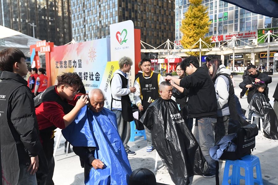 11月29日,在贵州省2025年“12·5”国际志愿者日省级志愿服务示范活动现场,志愿者正给市民义务理发(赵松 摄)