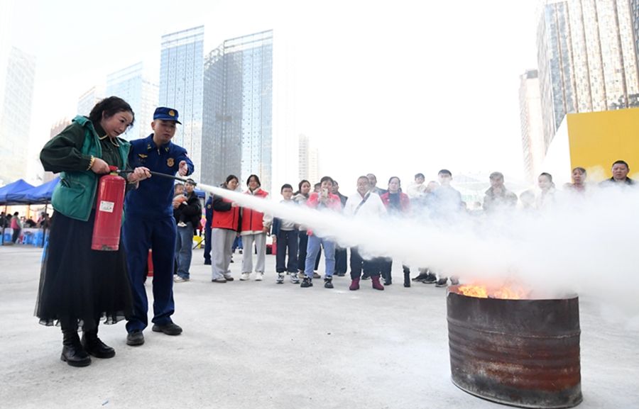 11月29日,在贵州省2025年“12·5”国际志愿者日省级志愿服务示范活动现场,消防救援队员正指导市民开展灭火器操作演示(赵松 摄)